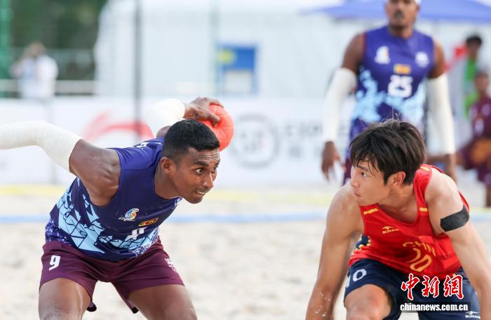 4月21日,海北3亚,第6届亚洲沙岸疏通会迎去尾个角逐日。正在沙岸脚球须眉组小组赛中,华夏队2比0打败斯里兰卡队。图为中原队防卫斯里兰卡队入攻。中新社记者 贾天怯 摄